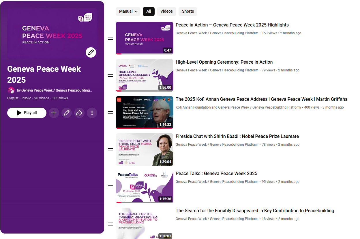 Voyez le rapport GPW25, un document complet rassemblant toutes les informations relatives à la 12e édition de la Semaine de la paix de Genève, qui s'est tenue du 13 au 17 octobre 2025 sous le thème La paix en action. Le rapport comprend le programme complet, les chiffres clés, une liste complète des organisations participantes et des intervenants, ainsi que des aperçus exclusifs sur l'organisation de l'un des plus grands forums mondiaux de consolidation de la paix.